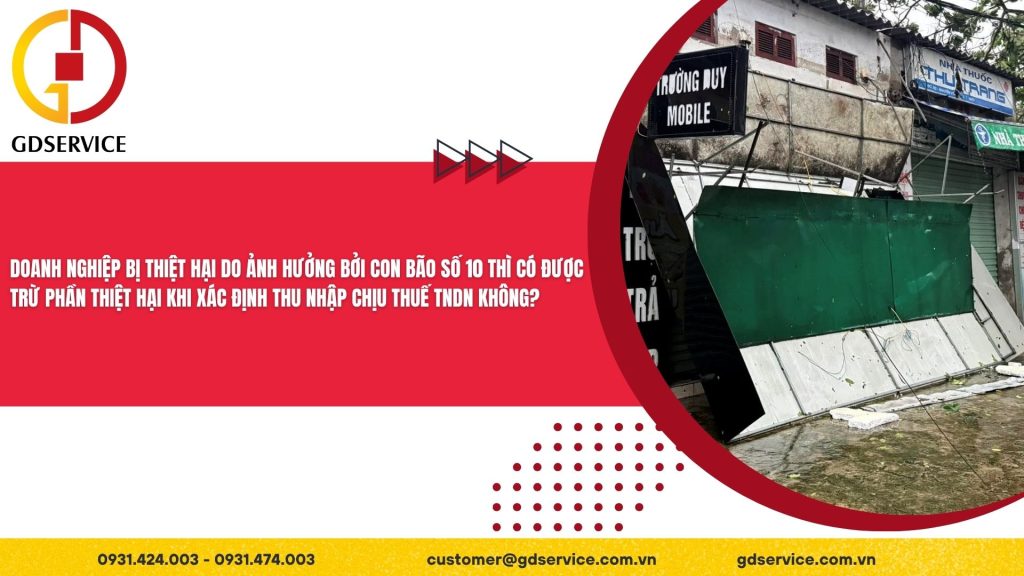 Doanh nghiệp bị thiệt hại do ảnh hưởng bởi con bão số 10 thì có được trừ phần thiệt hại khi xác định thu nhập chịu thuế TNDN không? Tính số tiền thuế TNDN phải nộp như thế nào? Các khoản tài trợ mà hỗ trợ doanh nghiệp bị ảnh hưởng do bão có phải chịu thuế TNDN không? Hãy cùng GDService tìm hiểu qua bài viết dưới đây nhé.